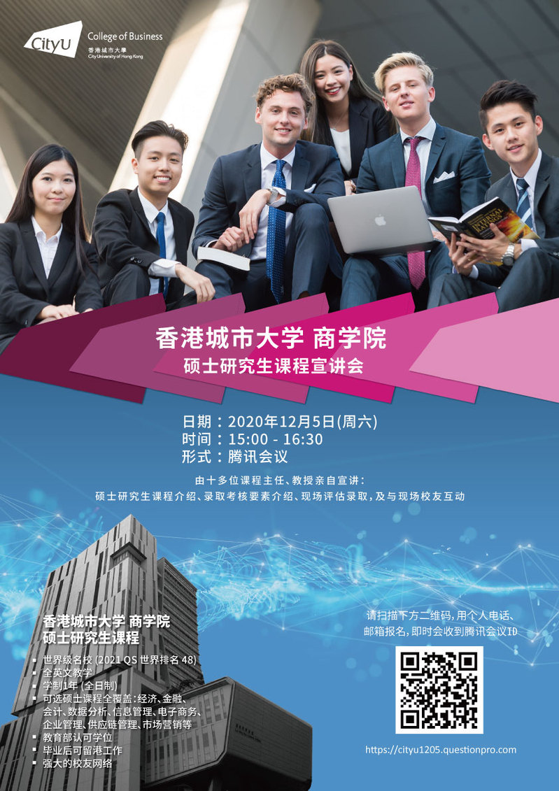 兹定于12月5日(周六)下午3点至4点半将专门针对贵校和其它几所内地双一流大学推出我们香港城市大学商公司硕士生课程的宣讲会,宣讲会将于腾讯会议的形式进行,届时会有十多位课程的负责教授介绍课程,部分课程会当场预录取一部分员工。