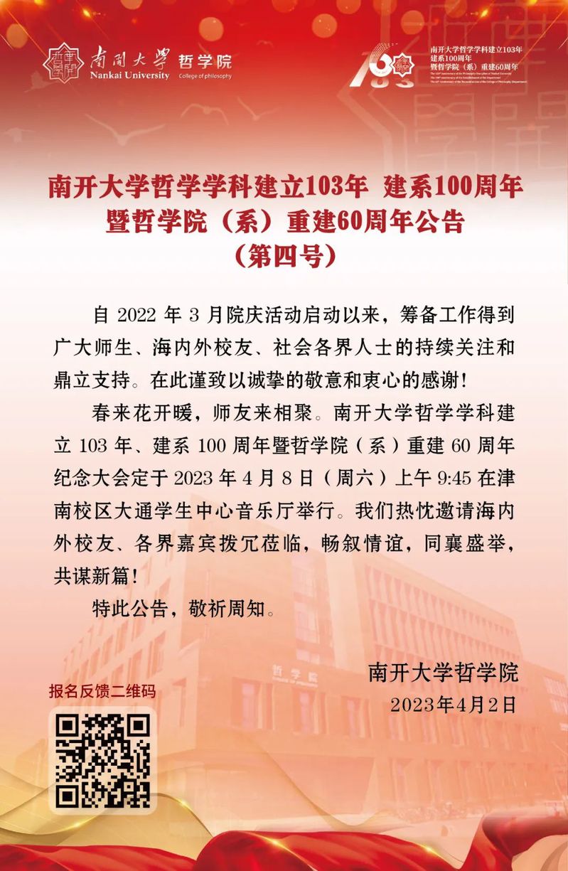 第四号公告|DB视讯哲学学科建立103年 建系100周年暨db真人体育官网(系)重建60周年