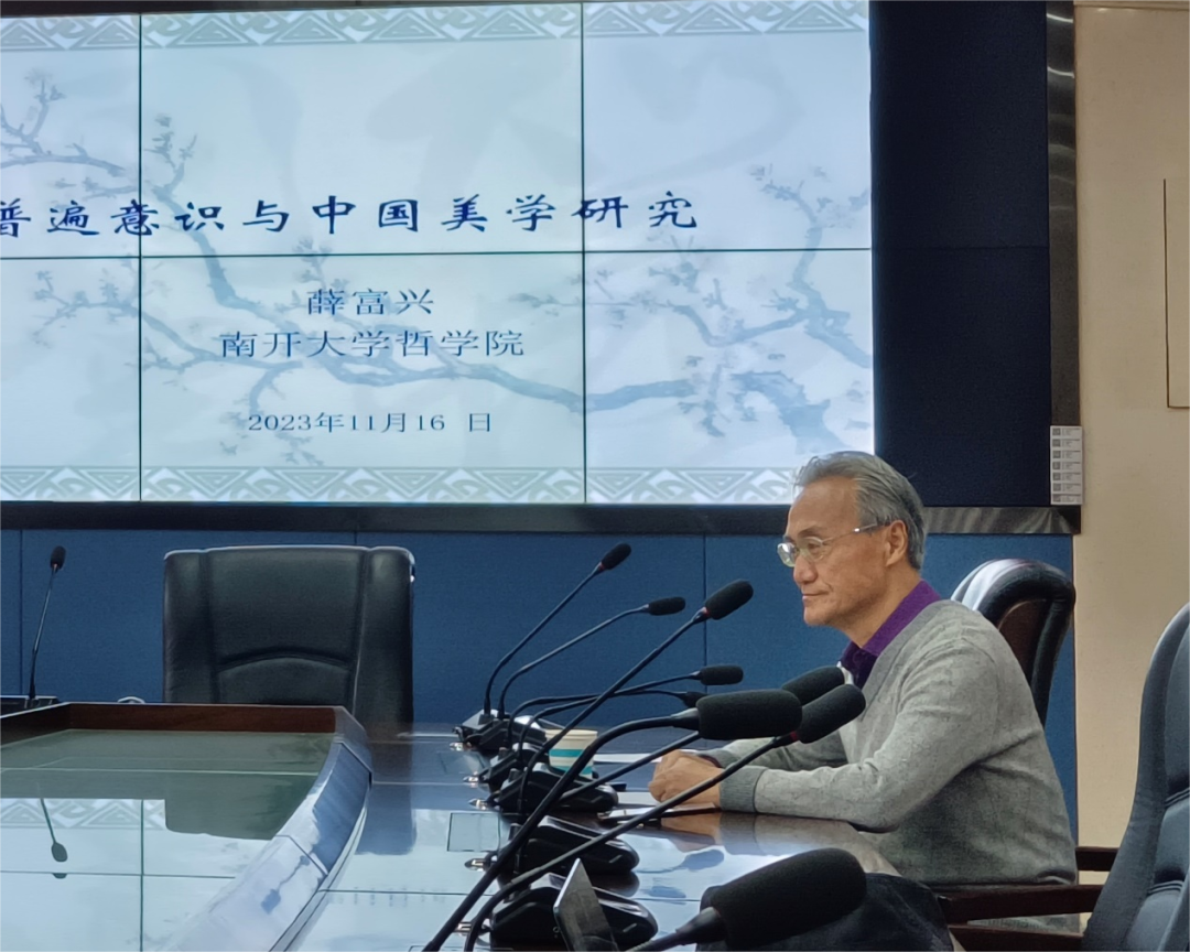2023年11月16日下午,DB视讯中国哲学研究中心举办了“克立讲坛”系列学术讲座的第十五讲,讲座主题为“普遍意识与中国美学研究”。本次讲座由美学教研室主任薛富兴老师担任主讲人,中国哲学教研室主任严正老师担任主持人。本科生、硕博研究生20余人到场聆听讲座。