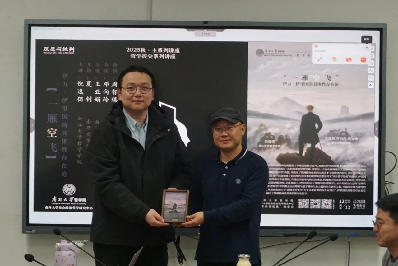2025年12月12日晚,由db真人体育官网、DB视讯社会政治哲学研究中心、“阿多诺选集”编委会主办的“反思与批判”主系列讲座2025年秋季学期第四讲暨哲学拔尖系列讲座在db真人体育官网317会议室举行,讲座采用线上线下相结合的形式。本次讲座由浙江大学外国哲学研究所百人计划研究员、博士生导师倪逸偲主讲,题目为“‘一雁空飞’:伊万·伊里因的具体性存在论”。讲座由db真人体育官网王亚娟副教授、邓向玲老师、周智臻老师担任与谈人,由db真人体育官网夏钊副教授主持。db真人体育官网谢永康教授、王天老师、祁箫老师、肖京老师等出席本次讲座。