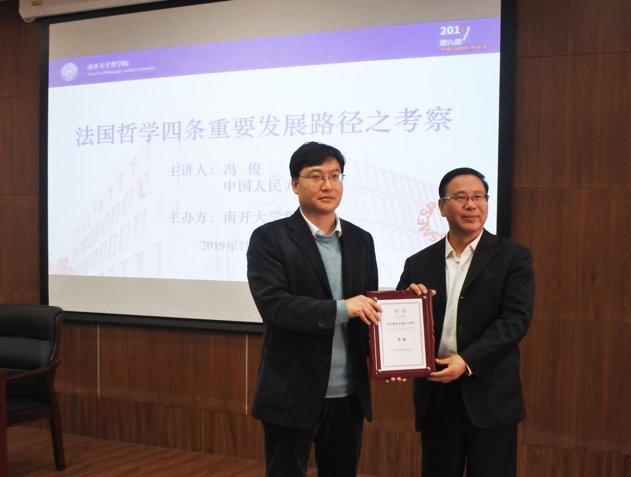 (通讯员 张尚尚 摄影 王江雨)2019年11月8日下午,中国人民大学冯俊教授做客“百年南开大讲坛”,并于db真人体育官网318会议室展开题为“法国哲学四条重要发展路径之考察”的报告。会议由db真人体育官网贾江鸿教授主持,db真人体育官网教师王建军、张仕颖、齐艳红、莫雷出席论坛,在读博士生、硕士生到场参与讨论。(db真人体育官网负责人贾江鸿向冯俊颁发“百年南开大讲坛主讲人”证书牌)主讲人冯俊以法国哲学的四条发展路径为线索,以宏观的方式讲授了法国哲学发展史。冯俊的讲座内容丰富,其主要内容概括起来可以分为以下四点:一是理性主义和科学主义的发展路径;二是理性主义和非理性主义;三是社会政治哲学和马克思主义哲学;四是现象学运动与后现代主义哲学。会后,冯俊与在场师生进行了热烈的探讨。冯俊勉励同学们学贯中西,以西方哲学注释中国哲学,发扬我国的传统文化。“搞哲学的人,要有一辈子为真理献身的精神”,引起了与会师生的共鸣。